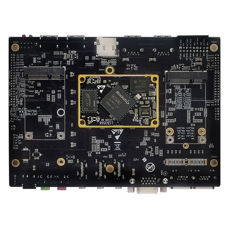 The LKD3568J comes with 1 USB 3.0 HOST, 1 USB 3.0 OTG, and 2 USB 2.0 HOST interfaces, allowing for the connection of multiple USB cameras; it also has 3 mini-PCIe slots, which, in addition to supporting 4G/5G modules, can also accommodate our company's mini-PCIe interface NPU computing cards developed based on the RK1808, combining with multiple cameras to form an artificial intelligence vision computing board card that supports up to 6.0TOPS in computing power. Additionally, the LKD3568J supports common communication module interfaces such as dual-band WIFI 6, BT5.0, 2 Gigabit Ethernet, UART, I2C, CANBUS, and offers multiple display interfaces including 2 HDMI outputs, 1 VGA output, 1 dual-channel LVDS, supporting multi-screen display with different content. It can also be optionally equipped with support for 1 HDMI input or MIPI-CSI camera input.