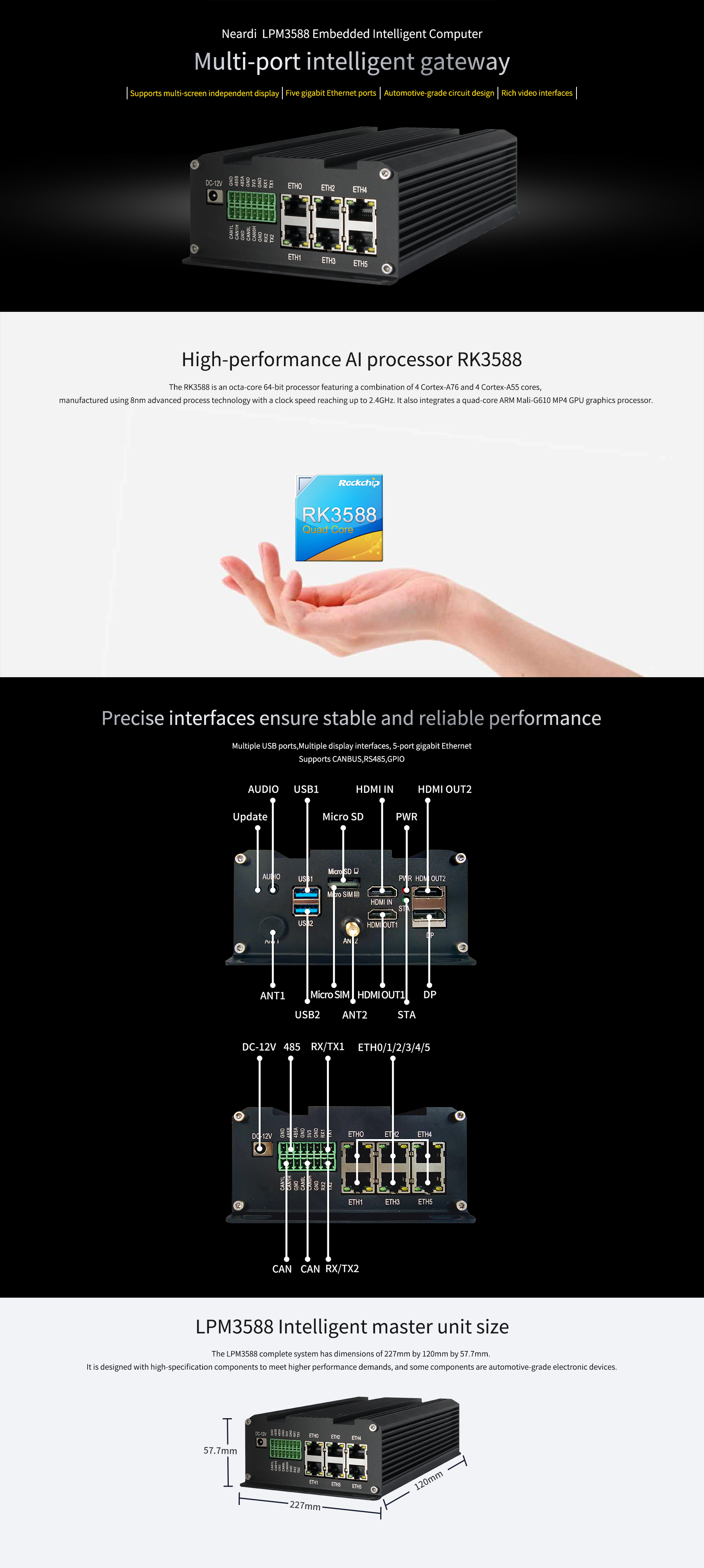 Product :The LPM3588 smart computing device is crafted with a full aluminum body and a fanless design, achieving efficient heat dissipation through an innovative internal structure. This allows it to operate stably in harsh industrial environments and be widely applied across various scenarios. The device offers a multitude of interfaces, including 2 Type-A USB 3.0 HOSTs for connecting USB cameras, 1 mini-PCIe slot for expanding 4G modules or NPU computing cards, and support for dual-band WiFi 6, Bluetooth 5.0, 5 Gigabit Ethernet ports, CANBUS, and RS485 communication module interfaces. In terms of display, the LPM3588 provides 2 HDMI outputs, 1 HDMI 2.0 interface input, 1 DP interface output, and supports multi-screen display with different content.