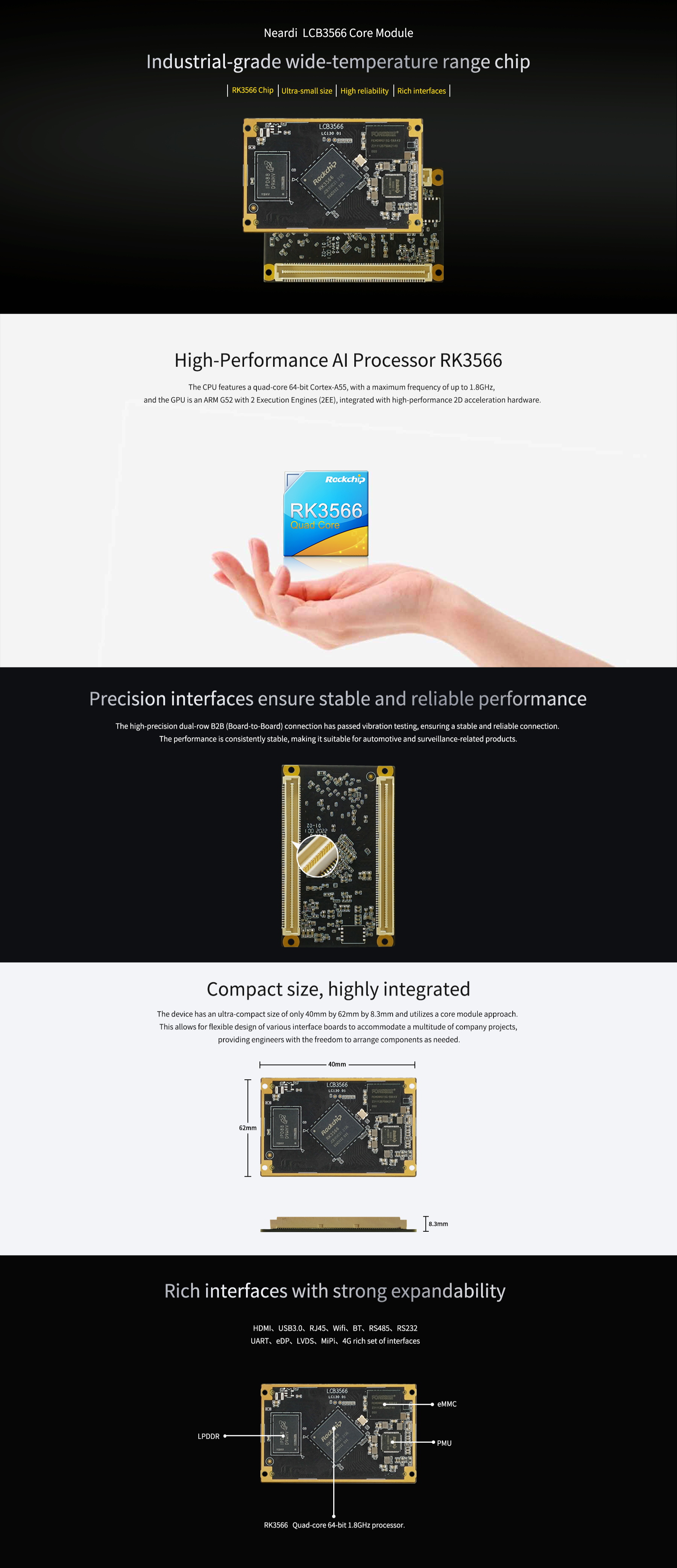 Product :The core module connects to the baseboard using two Amphenol 120-pin dual-row board-to-board connectors with a 0.8mm pitch, secured with four M2 screws, which ensures stability and reliability, and is easy to install and maintain.
