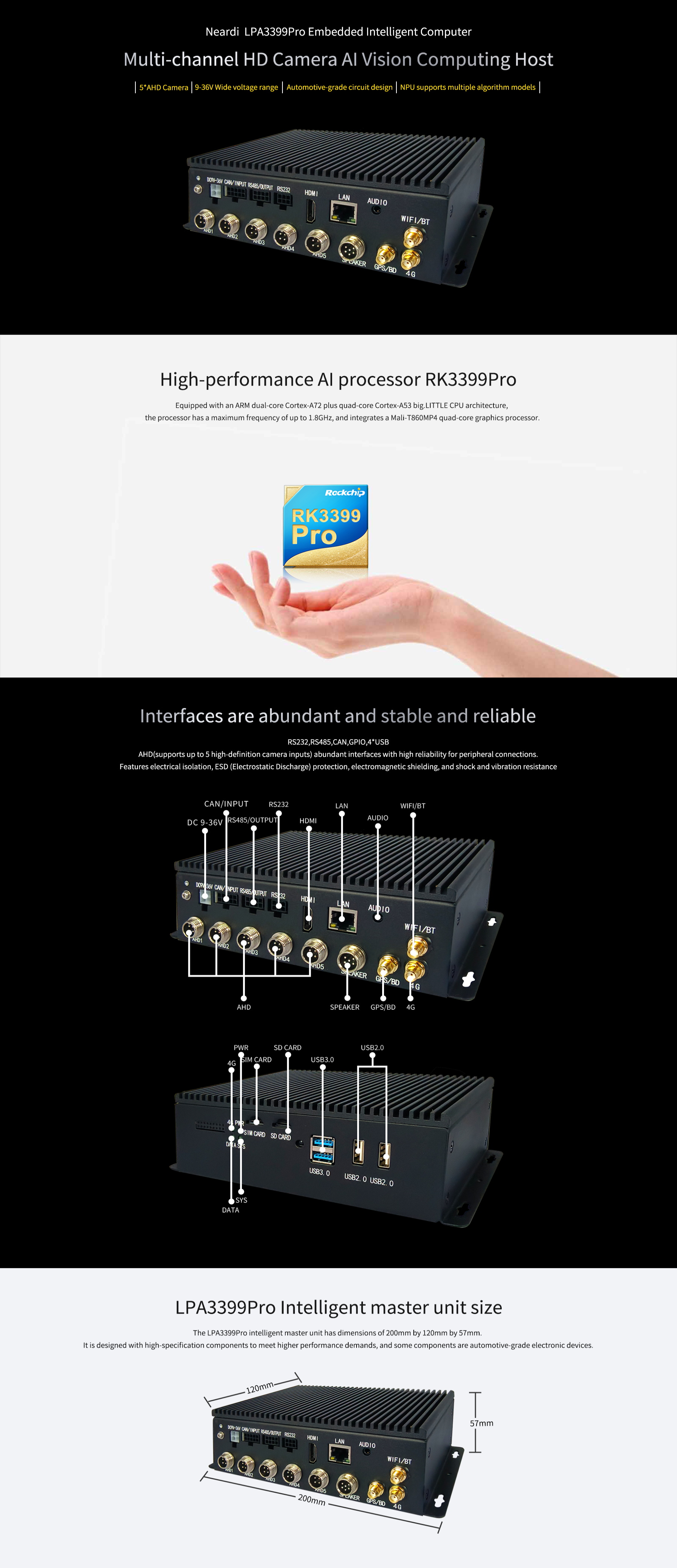 Product :The LPA3399Pro smart computing device integrates a variety of communication modules, including dual-band WiFi that supports 802.11a/b/g/n/ac, BT5.0 low-power Bluetooth, GPS+BD dual-mode navigation, seven-mode global 4G communication, and a 9-axis motion sensor. Additionally, it supports communication interfaces such as RS232, RS485, CAN, and Gigabit Ethernet, offering users a diverse selection of hardware interface options.