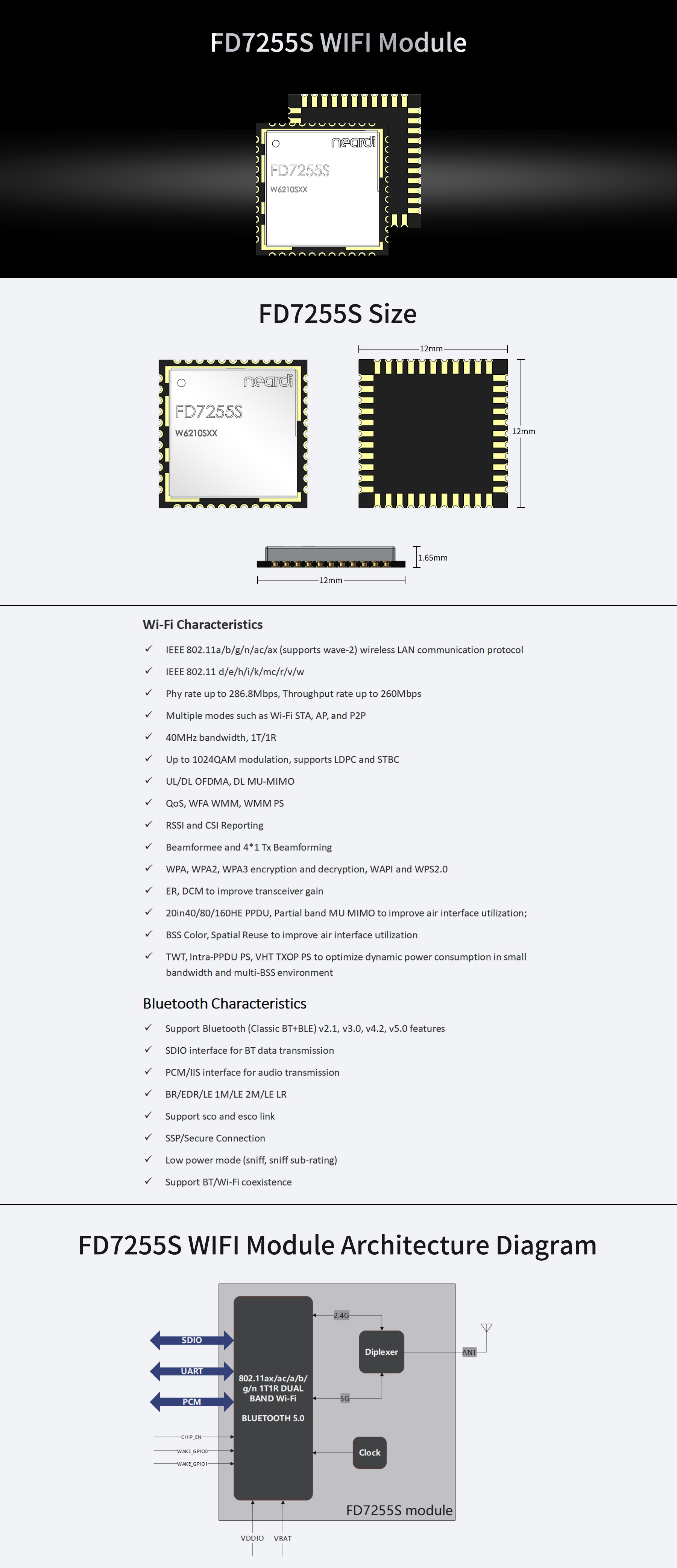 Product description | 802.11ax/ac/a/b/g/n 1T1R dual band Wi-Fi and Bluetooth 5.0 comb module | ||