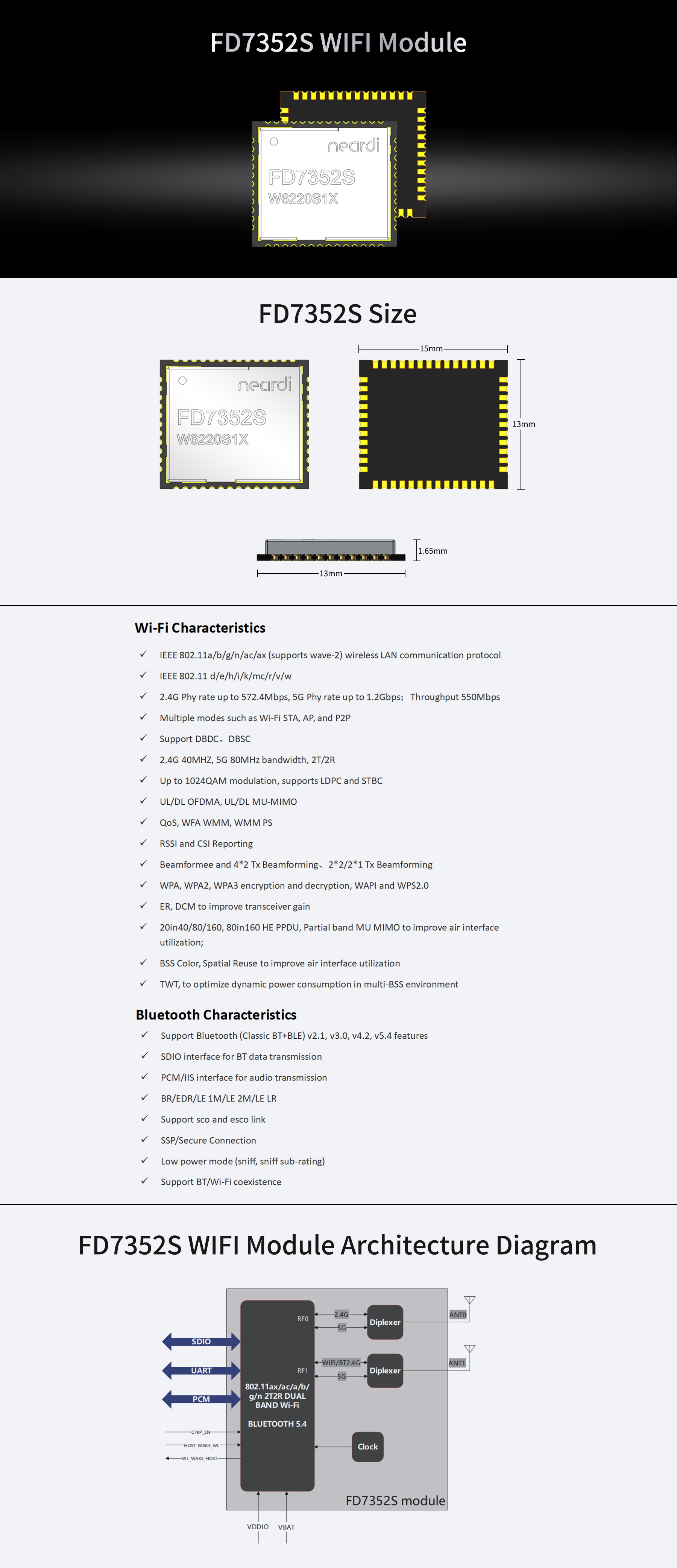 Product description | 802.11ax/ac/a/b/g/n 2T2R dual band Wi-Fi and Bluetooth 5.4 comb module | ||