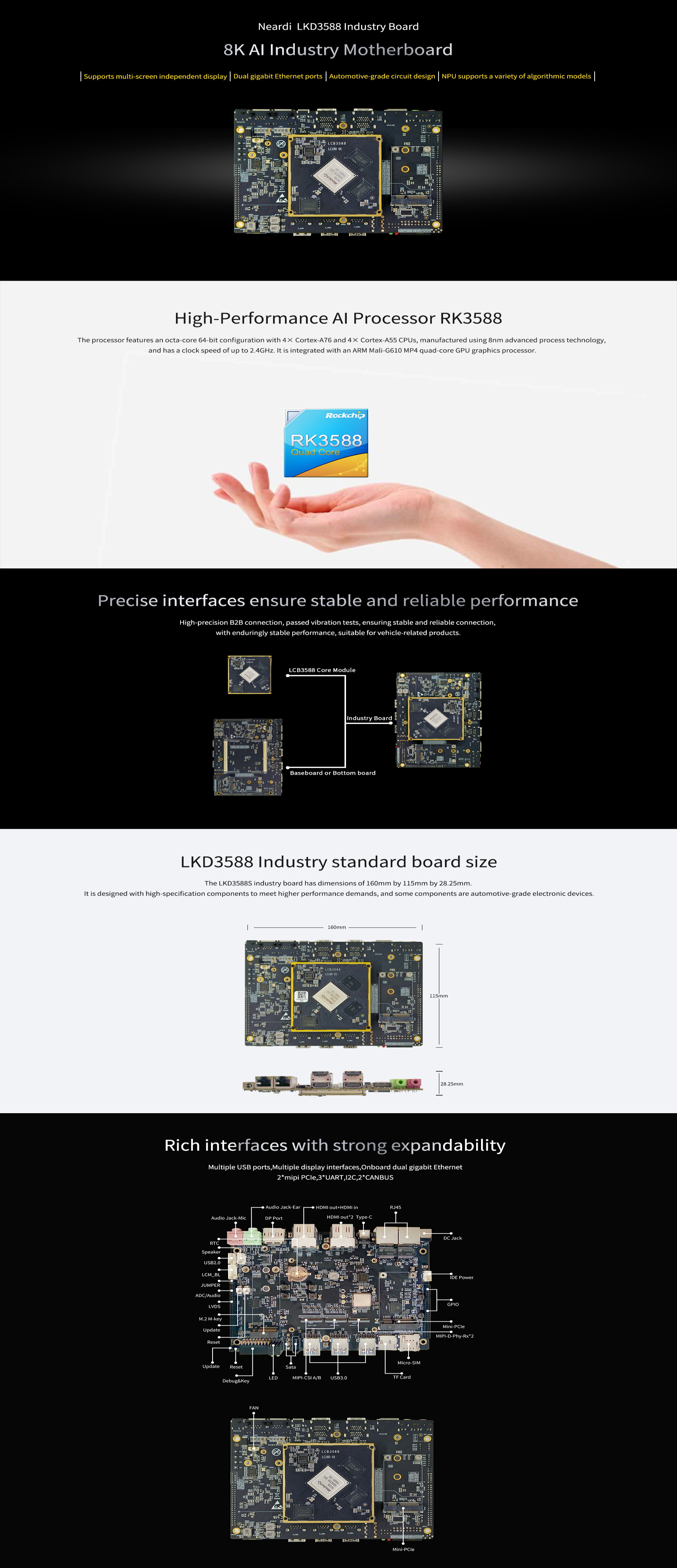 Product :The LKD3588 provides 3 Type-A USB 3.0 HOST ports, 1 Type-C USB 3.1 OTG port, and 1 4-pin PH2.0 USB 2.0 HOST interface, supporting the connection of multiple USB cameras. It also has 2 mini-PCIe slots for attaching 4G modules or NPU computing cards based on the RK1808. In addition, the board supports dual-band WiFi 6, Bluetooth 5.0, dual 1000M Ethernet ports, and communication interfaces such as UART, I2C, RS232, RS485, and CANBUS. It also offers multiple display interfaces, including 3 HDMI outputs, 1 dual-channel LVDS output, and 1 DP interface output, supporting multi-screen display with different content. The board can also support multiple MIPI-CSI camera inputs and 1 HDMI 2.0 interface input.