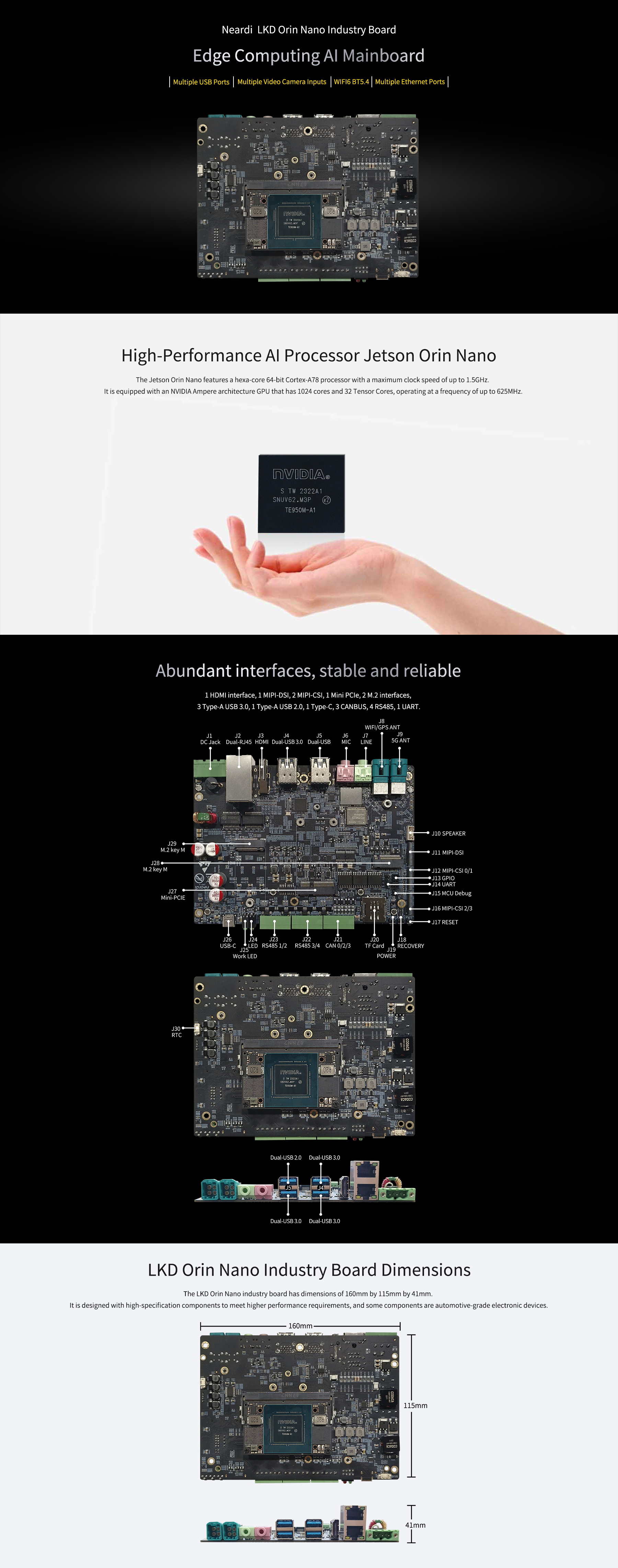 Product:The LKD Orin Nano is equipped with the Jetson Orin NX module, offering high-performance AI computing capabilities of up to 100 Tops. Based on the NVIDIA Ampere architecture GPU, it has up to 1024 CUDA cores and 32 Tensor cores. It integrates the next-generation Deep Learning Accelerator (DLA) and Programmable Vision Accelerator (PVA), providing powerful AI inference and image processing capabilities.