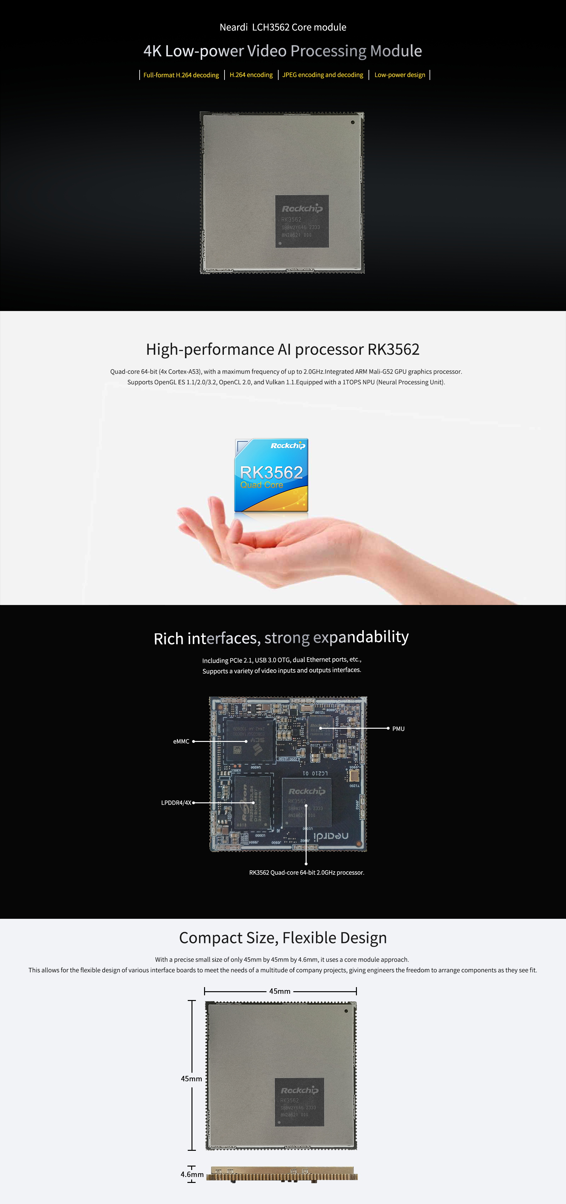 Product:The LCB3562 includes the CPU, DDR, eMMC, and PMU sections. The DDR uses the mainstream market model LPDDR4/LPDDR4X, with lower power consumption and faster frequency, available in 2GB/4GB/8GB configurations; the eMMC adopts the high-speed eMMC 5.1 standard, available in 16GB/32GB options. The LCB3562 core module supports a variety of video codecs, including H.264, H.265, and VP9, with a maximum support for 4K@30fps video decoding and 1080p@60fps video encoding. It has high-quality JPEG encoding and decoding capabilities. In terms of display, the RK3562 supports MIPI-DSI, LVDS, and RGB video outputs, capable of supporting resolutions up to 2048x1080@60Hz. It boasts a rich set of peripheral interfaces, including PCIe2.1, USB3.0 OTG, dual Ethernet ports, CANFD interfaces, etc., to meet diverse peripheral expansion needs.