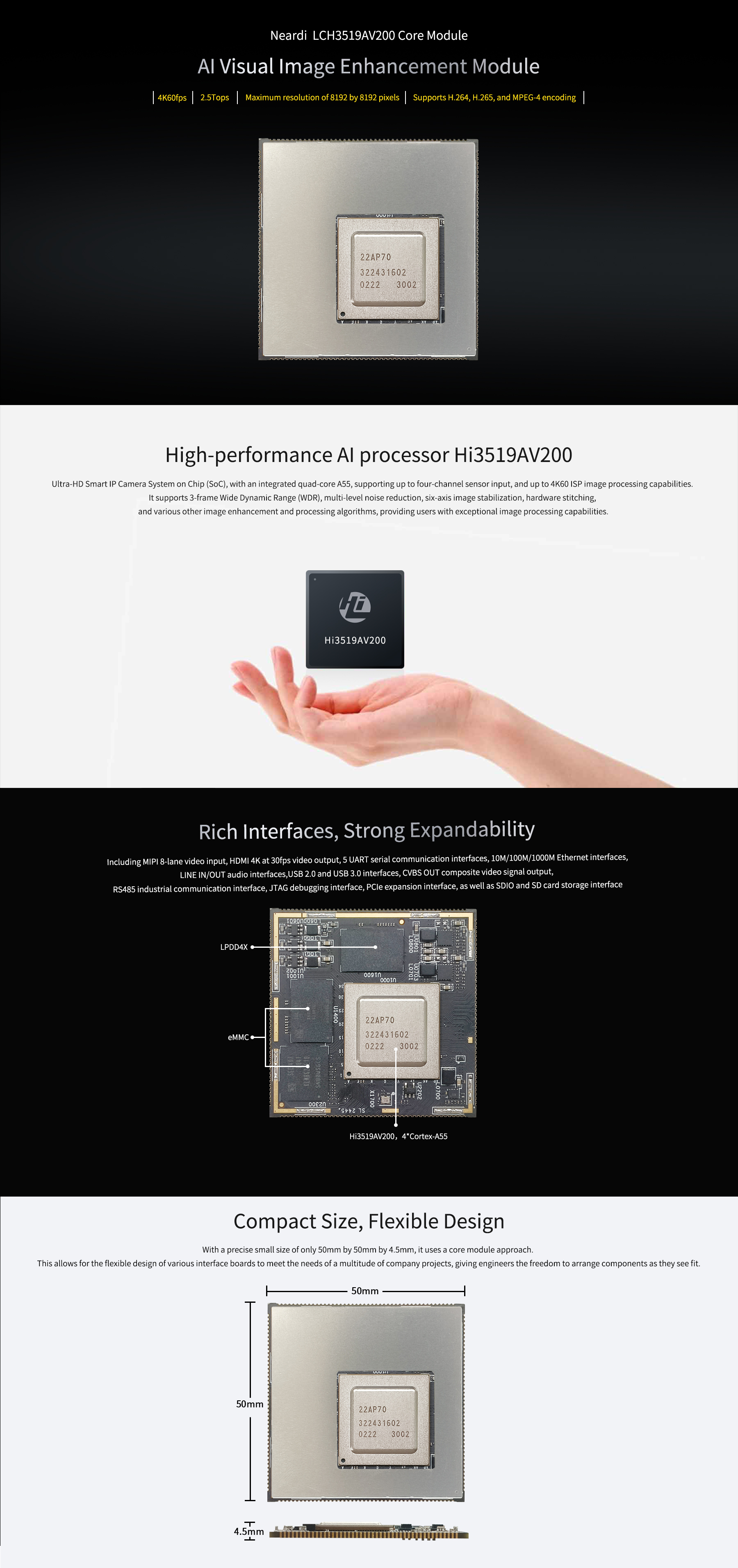 Product:The LCB3519AV200 includes sections for the CPU, DDR, and eMMC. The DDR uses mainstream market models LPDDR4/LPDDR4X, with lower power consumption and faster frequencies, available in 4GB/8GB configurations; the eMMC adopts the high-speed eMMC 5.1 standard, available in 32GB/64GB options. It boasts a rich set of peripheral interfaces, including MIPI 8Lane video input, HDMI 4K30fps video output, 5 UART serial communication interfaces, 10M/100M/1000M Ethernet interfaces, LINE IN/OUT audio interfaces, USB2.0 and USB3.0 interfaces, CVBS OUT composite video signal output, RS485 industrial communication interface, JTAG debugging interface, PCIe expansion interface, as well as SDIO and SD card storage interfaces, supporting the needs of a variety of application scenarios.
