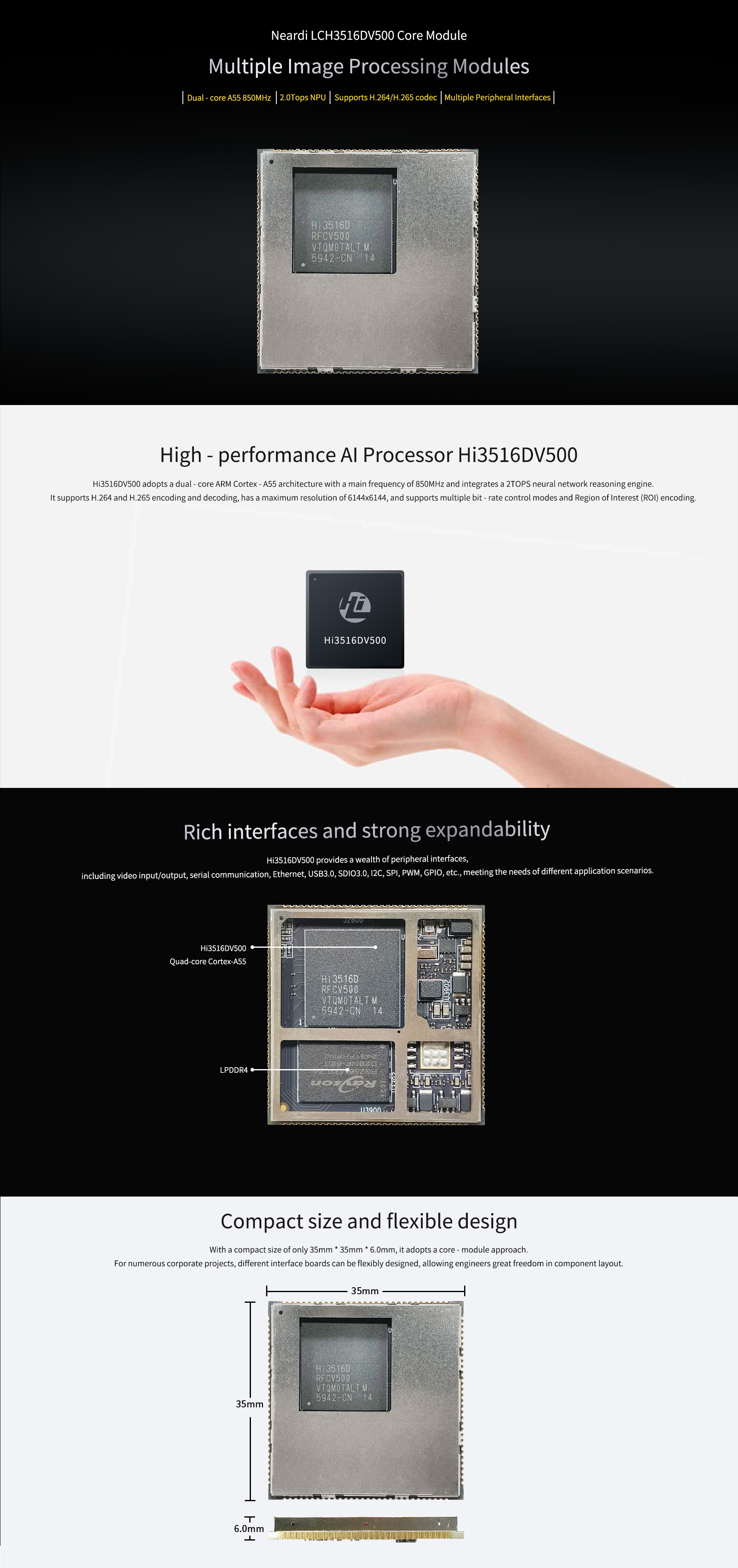 Product:The LCH3516DV500 core module features an efficient neural - network inference engine, reaching up to 2TOPS INT8. It supports dual - sensor inputs and 5M@30fps ISP image processing. With capabilities like 2 - frame WDR, multi - stage noise reduction, six - axis image stabilization, and multi - spectral fusion, it also applies real - time noise reduction to input images via AI algorithms, delivering excellent image processing.