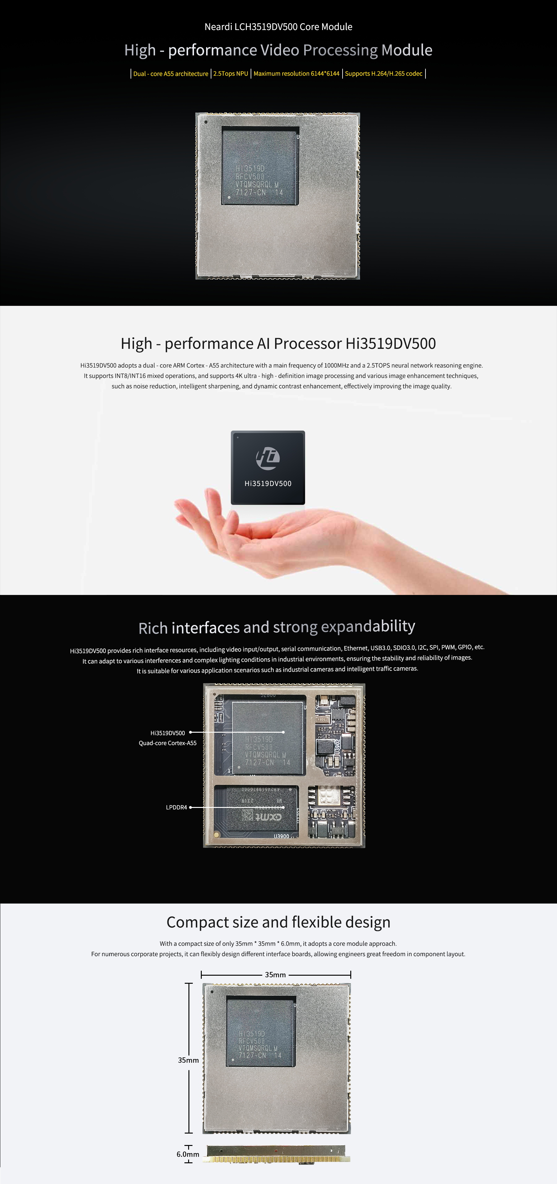 Product:The LCH3519DV500 is equipped with a dual - core A55, offering efficient, versatile and flexible CPU resources to meet customer computing and control needs. It integrates an efficient neural - network inference engine with up to 2.5TOPS NN computing power and supports major industry - standard neural - network frameworks. Additionally, it offers a stable and user - friendly SDK, enabling fast mass production of customer products.