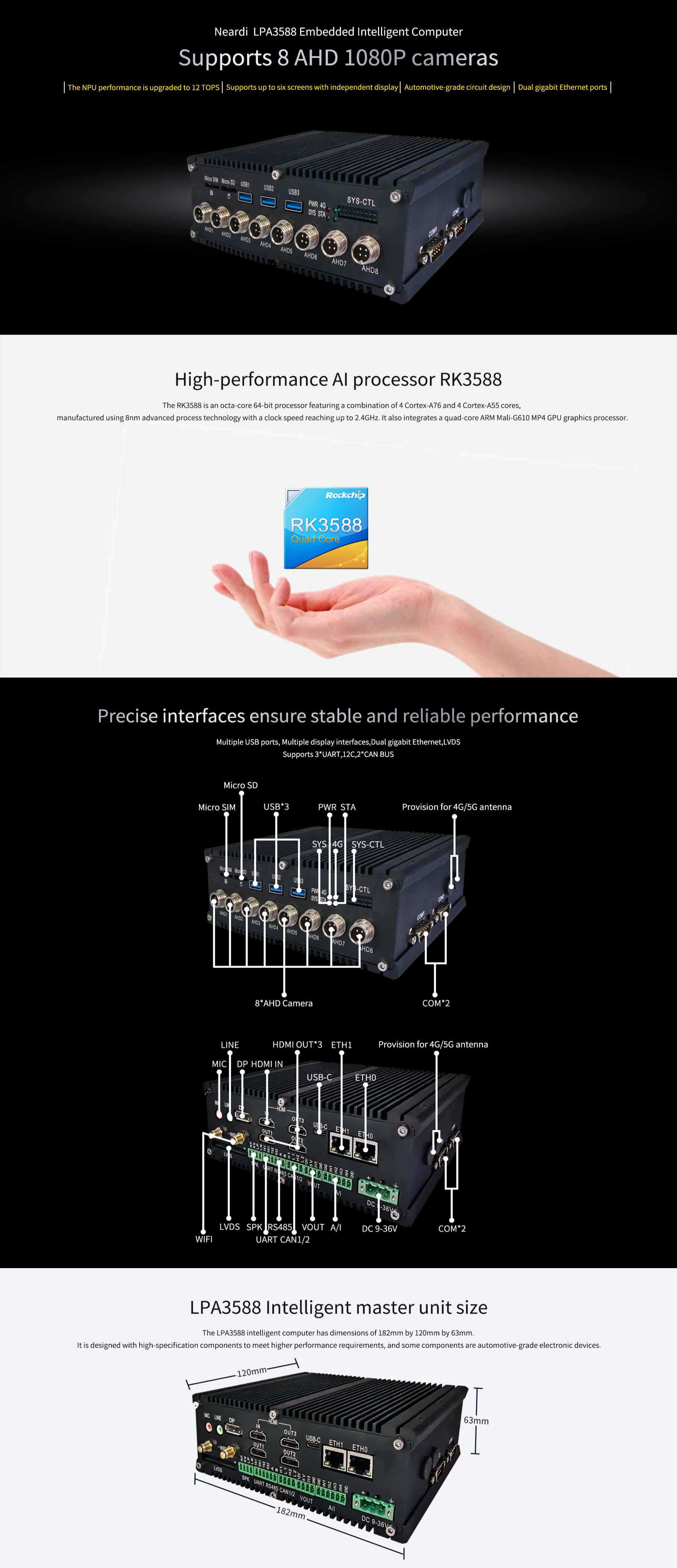 Product :The LPA3588 smart computing device offers 3 USB 3.0 HOST ports and 1 full-function Type-C interface, supporting the connection of multiple USB cameras, as well as 2 mini-PCIe slots for the expansion of 4G/5G modules or NPU computing cards. In terms of communication, it supports dual-band WiFi 6, Bluetooth 5.0, 2 Gigabit Ethernet ports, CANBUS, and RS485. For display interfaces, it includes 3 HDMI outputs, 1 HDMI input, 1 DP output, and 1 dual-channel LVDS interface, supporting audio input and output, multi-screen display with different content, and has a built-in M.2 NVMe solid-state drive interface.