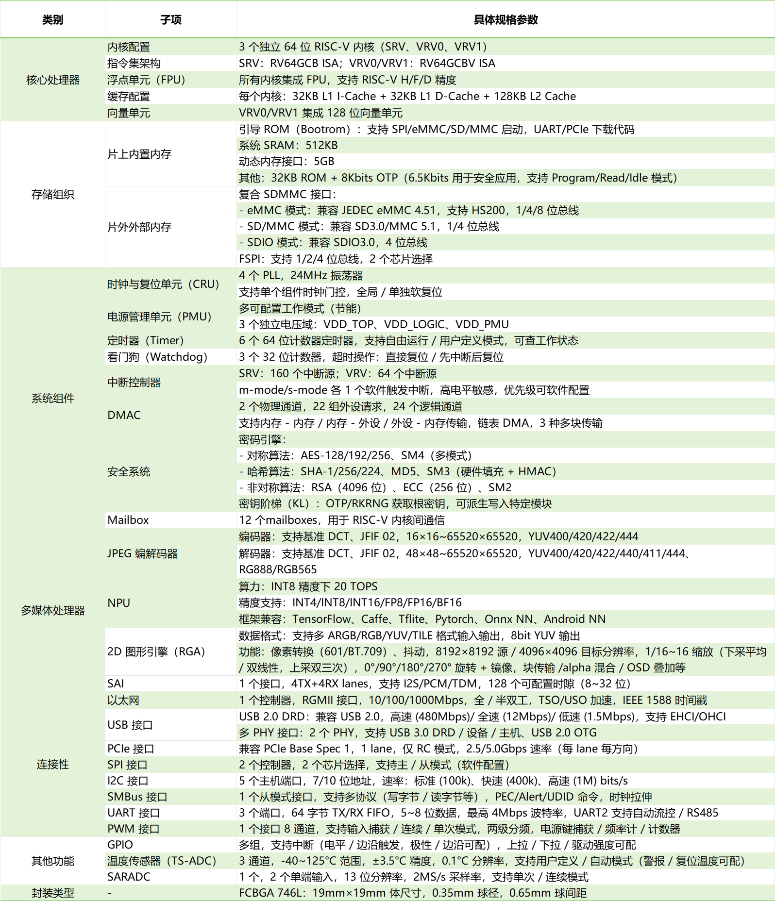 存儲組織 | 片上內置內存 | 引導 ROM(Bootrom):支持 SPI/eMMC/SD/MMC 啟動,UART/PCIe 下載代碼 |