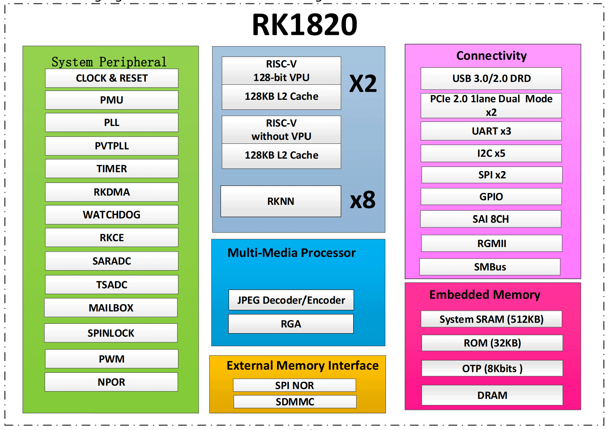 RK1820 擁有三個64 位RISC-V 內核(含 FPU),每個核配備 32 KB 指令緩存 + 32 KB 數據緩存 + 128 KB二級緩存。內置 NPU 支持混合精度運算(INT4 / INT8 / INT16 / FP8 / FP16 / BF16)算力高達 20 TOPS(具體取決于精度 / 模型),主核(RISC-V)負責模型調度 / 控制 / I/O,NPU專注推理集成 “超高帶寬片內DRAM,支持 PCIe 2.0 和 USB 3.0 PHY,方便與主處理器 / SoC 連接。