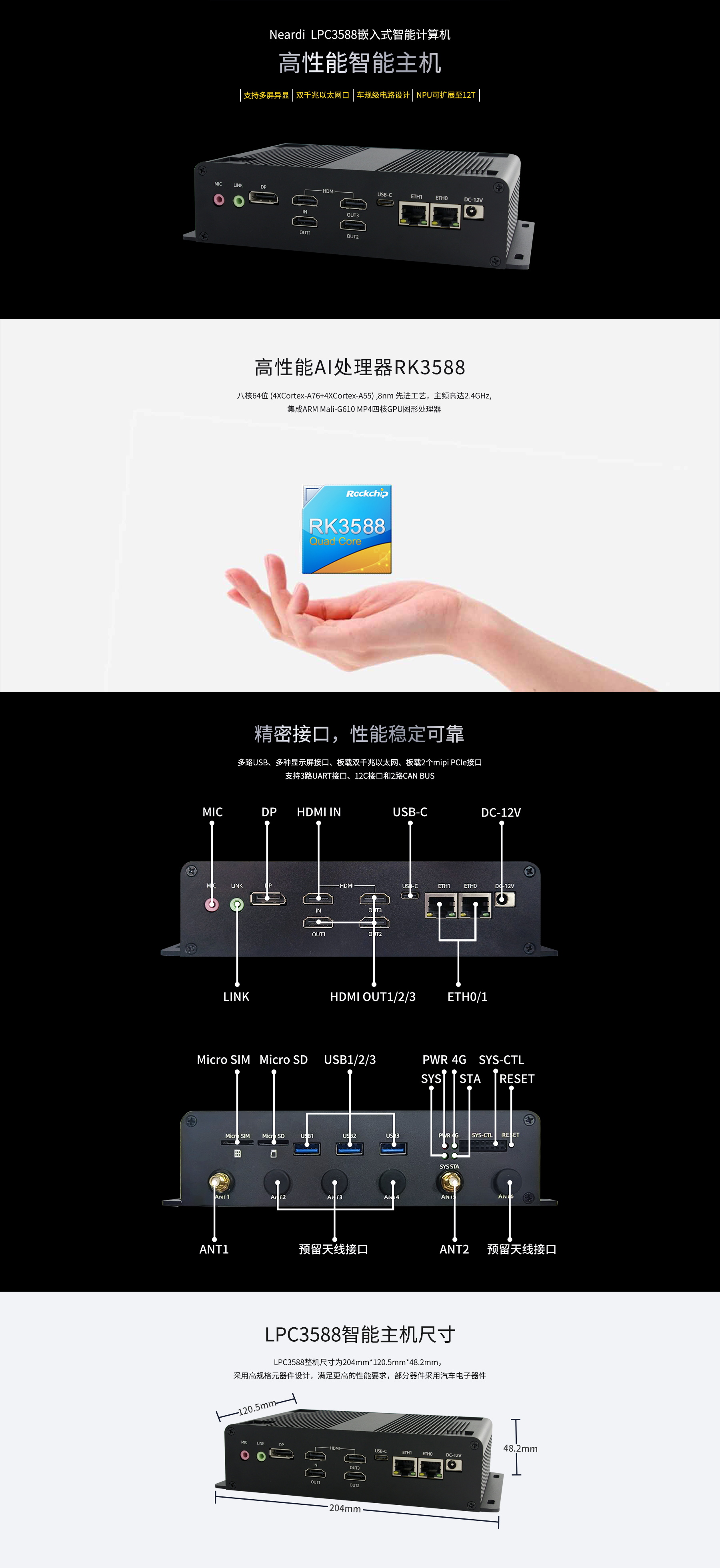 產(chǎn)品介紹 :LPC3588智能計(jì)算機(jī)提供3個(gè)Type-A USB 3.0 HOST和1個(gè)Type-C USB 3.1 OTG接口,支持連接多個(gè)USB攝像頭,以及2個(gè)mini-PCIe接口用于擴(kuò)展4G模塊或NPU計(jì)算卡。通訊方面,支持雙頻WIFI 6、藍(lán)牙5.0、雙路1000M以太網(wǎng)等。顯示接口包括3路HDMI輸出、1路HDMI 2.0輸入和1路DP輸出,支持多屏異顯。