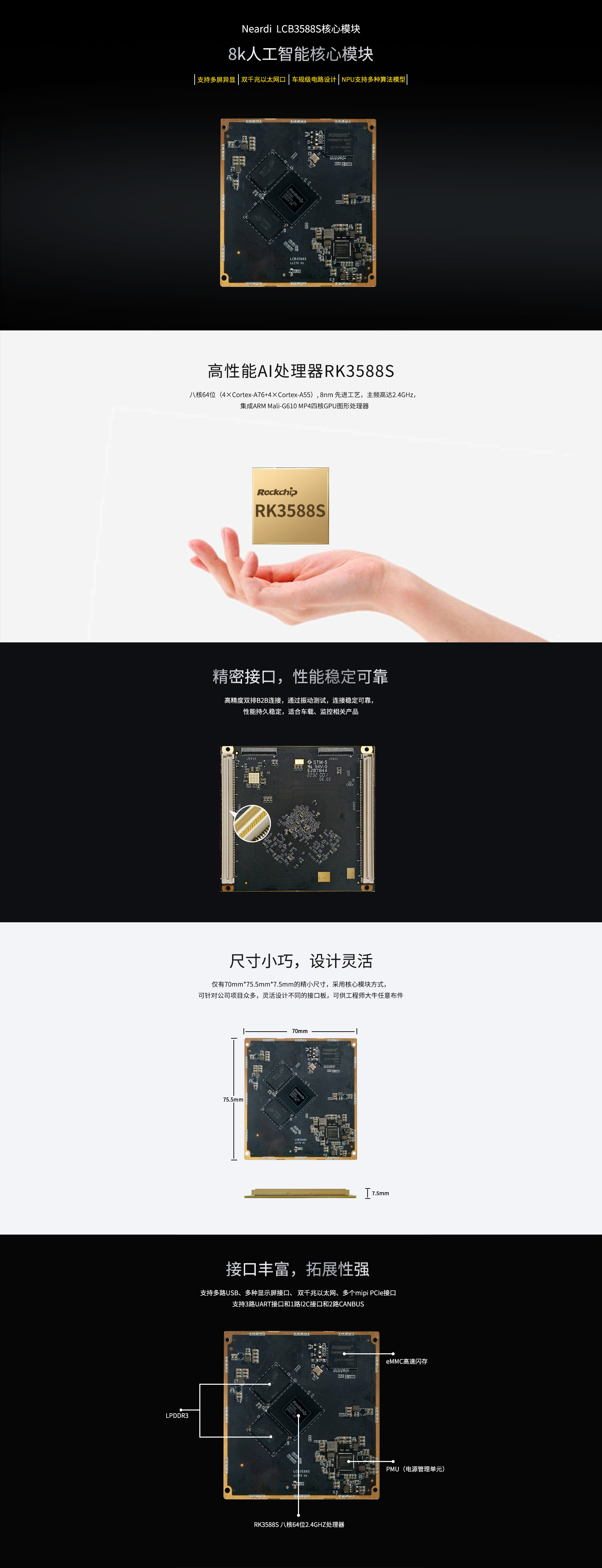 產(chǎn)品介紹 :核心模塊與底板的連接采用兩顆0.8mm pitch的140Pin板對板連接器和4顆0.5mm pitch的30Pin FPC連接器組合,并通過4顆M2的螺絲固定;真正全部引出了RK3588的所有對外引腳信號,同時兼顧了高可靠性,低成本,高靈活性的需求。