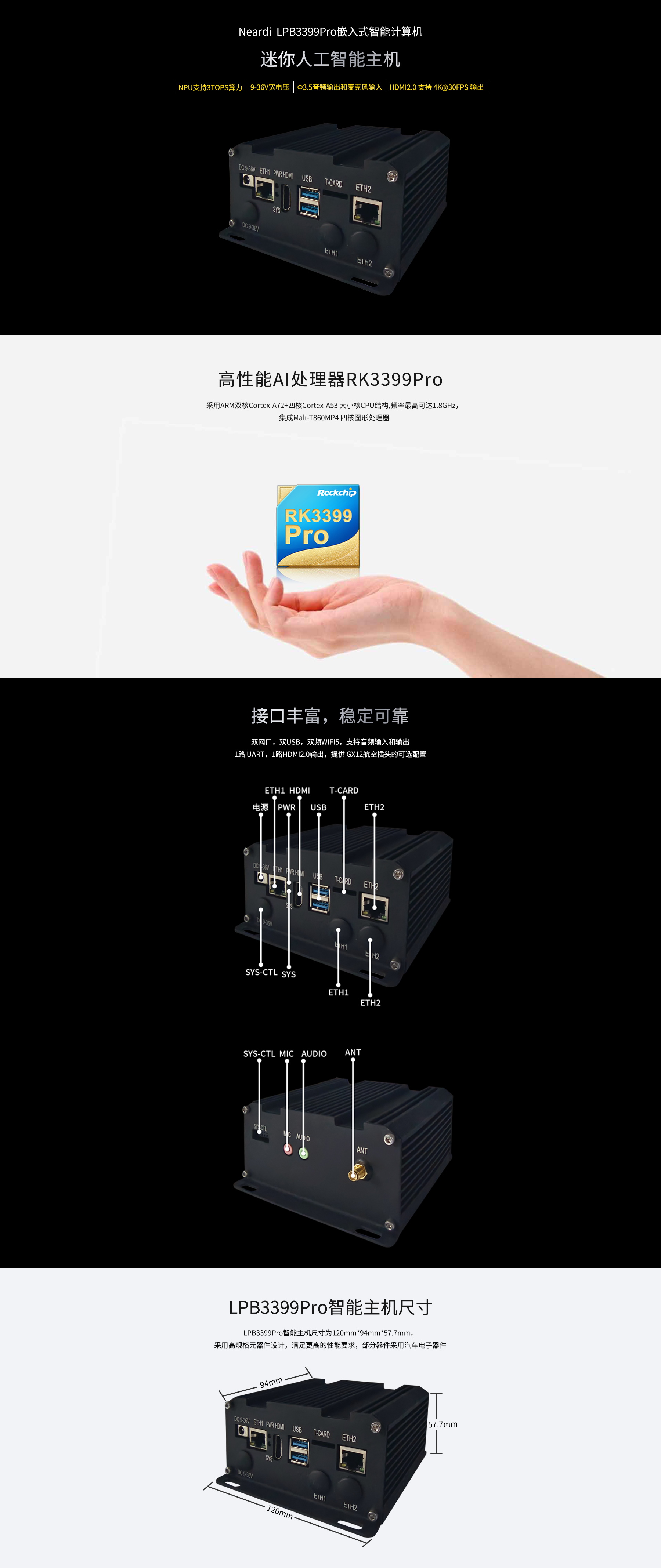 產品介紹 :LPB3399Pro智能主機板載1路USB 3.0 OTG和1路USB 2.0 HOST接口,支持外接USB攝像頭或其他外設;支持WIFI 5、藍牙5.0、1路1000M和1路100M以太網,以及高速UART等通訊接口;并支持1路HDMI 2.0輸出,包含音頻輸入和輸出功能。此外,LPB3399Pro還提供GX12航空插頭的可選配置,滿足特殊應用場景的高可靠性連接需求。