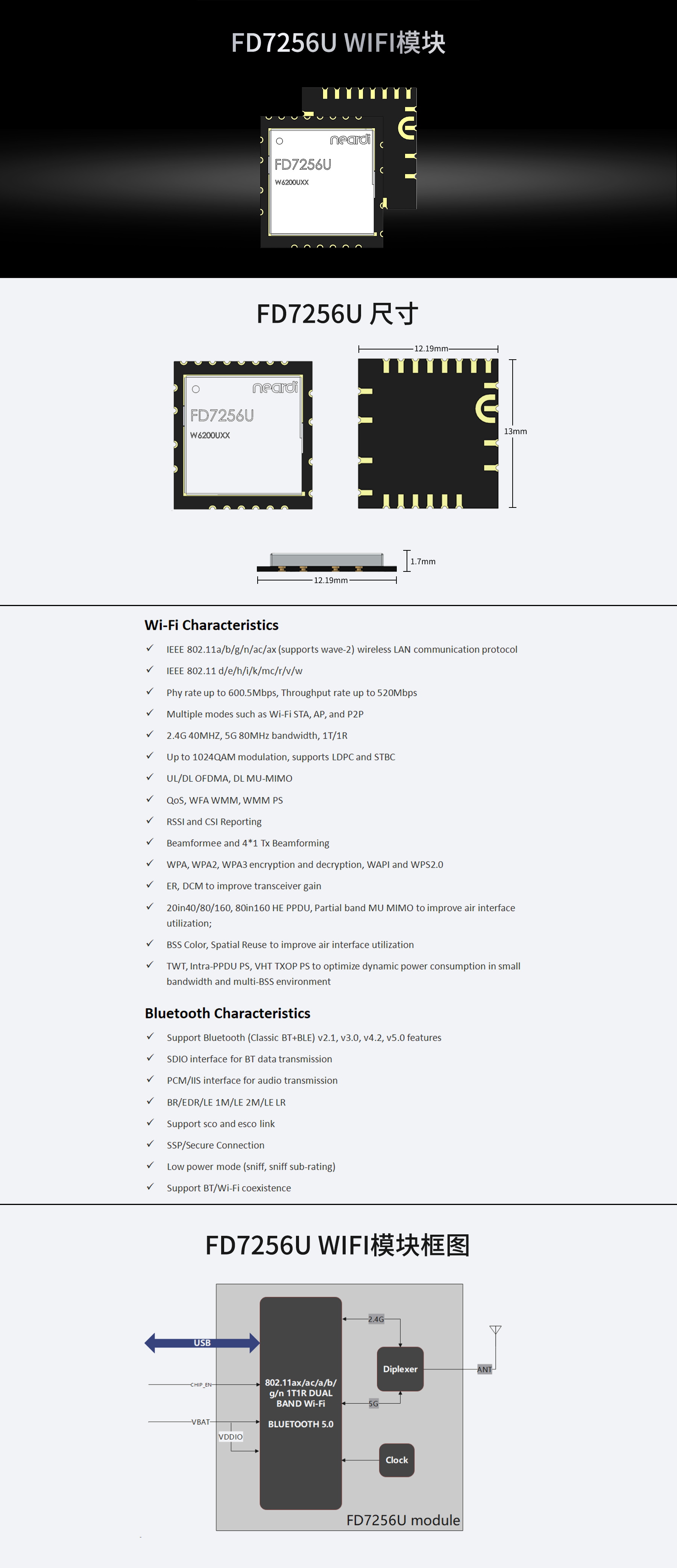 Product description | 802.11ax/ac/a/b/g/n 1T1R dual band Wi-Fi and Bluetooth 5.0 comb module | ||