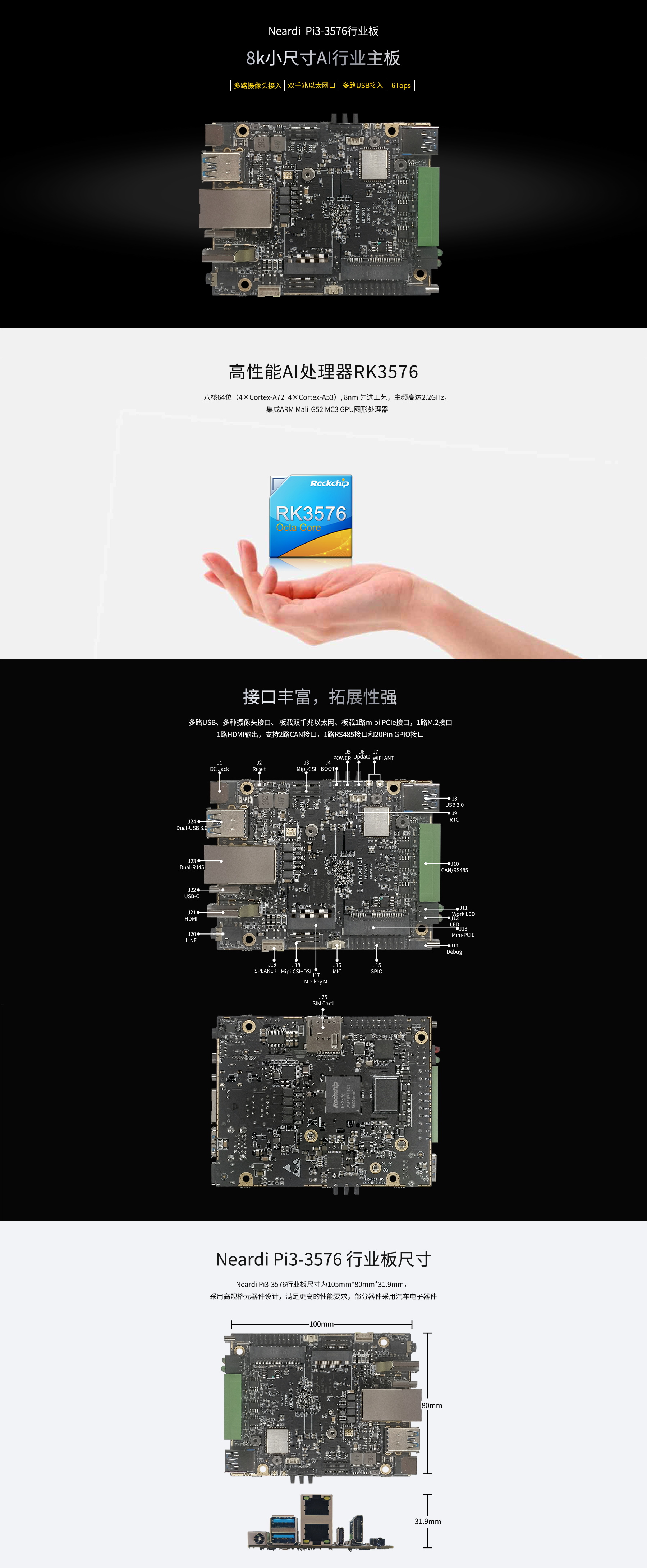 產(chǎn)品介紹:Neardi Pi 3板載3路Type-A USB3.0,2路Type-C USB;板載1個(gè)mini-PCIe接口,支持外接4G/5G模塊外;預(yù)留eMMC連接器和UFS連接座,1路M.2 key M接口,支持2242 SSD存儲(chǔ)擴(kuò)展;Neardi Pi 3還支持雙頻WIFI6、BT5.4;2路1000M以太網(wǎng)、UART、I2C、RS485、CANBUS、UART、SPI等常用通訊接口,支持1路HDMI輸出;另外還可支持多路mipi-csi攝像頭接口輸入以及mipi-dsi接口輸出。