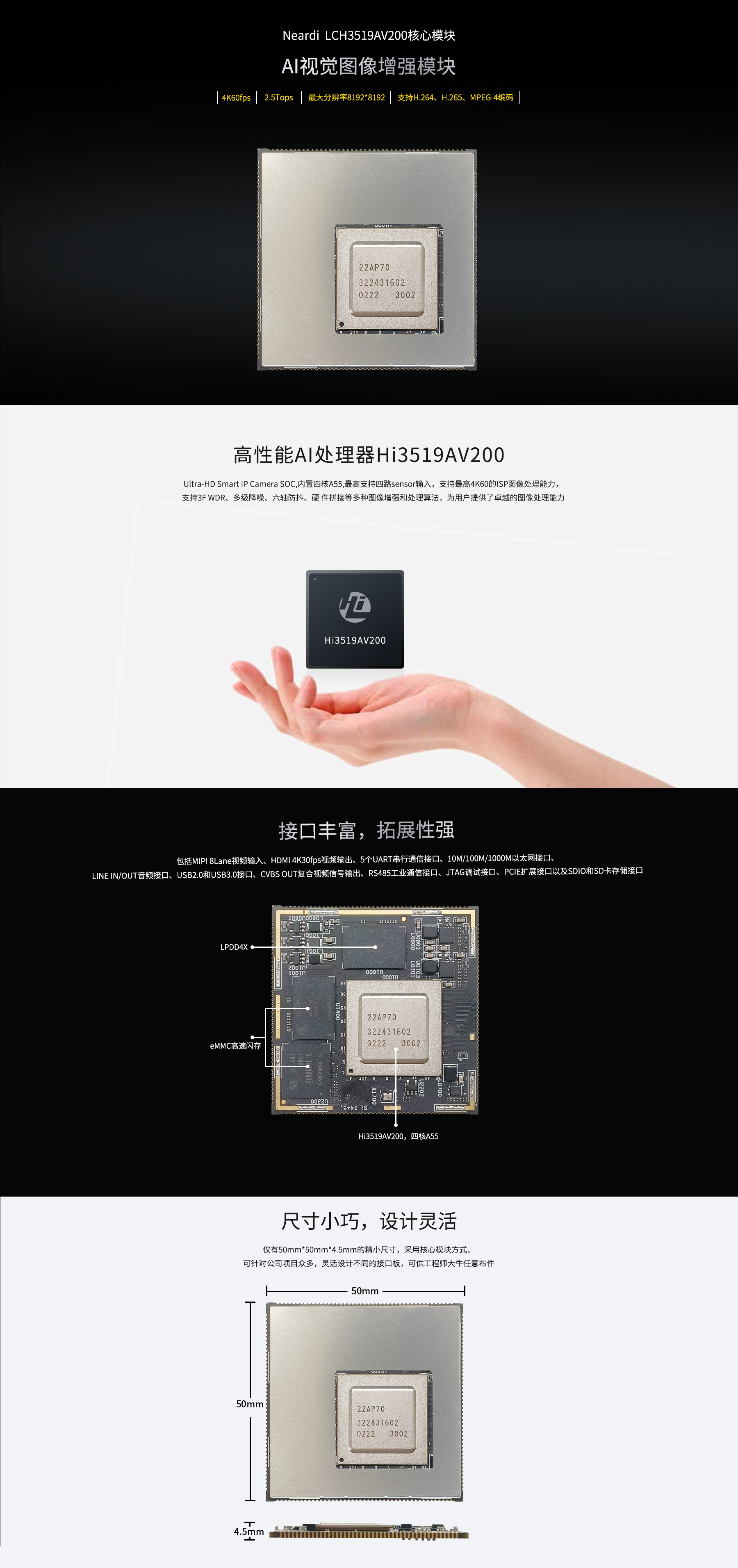 產品介紹:LCB3519AV200包含CPU、DDR、eMMC部分。DDR采用市場主流型號LPDDR4/LPDDR4X,更低功耗更快頻率,可選4GB/8GB配置;eMMC采用高速eMMC 5.1標準,可選32GB/64GB。擁有豐富的外設接口,包括MIPI 8Lane視頻輸入、HDMI 4K30fps視頻輸出、5個UART串行通信接口、10M/100M/1000M以太網接口、LINE IN/OUT音頻接口、USB2.0和USB3.0接口、CVBS OUT復合視頻信號輸出、RS485工業通信接口、JTAG調試接口、PCIE擴展接口以及SDIO和SD卡存儲接口,支持多種應用場景的需求。