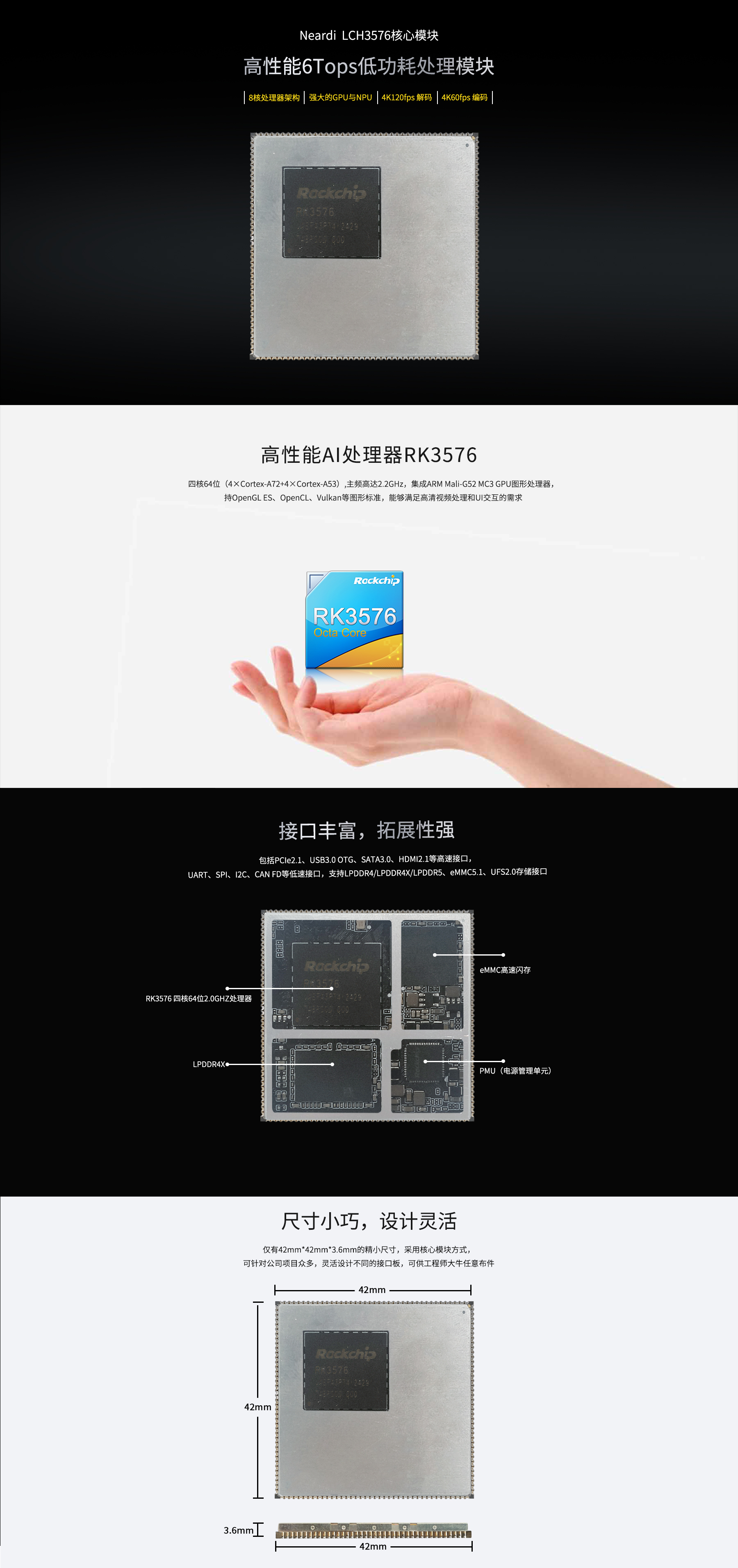 產品介紹:LCH3576包含CPU、DDR、eMMC和PMU部分。DDR采用市場主流型號LPDDR4/LPDDR4X,更低功耗更快頻率,可選4GB配置;eMMC采用高速eMMC 5.1標準,可選32GB容量配置;PMU由RK806及多路DC-DC和LDO組成,CPU核心電壓均支持DVFS動態調壓。