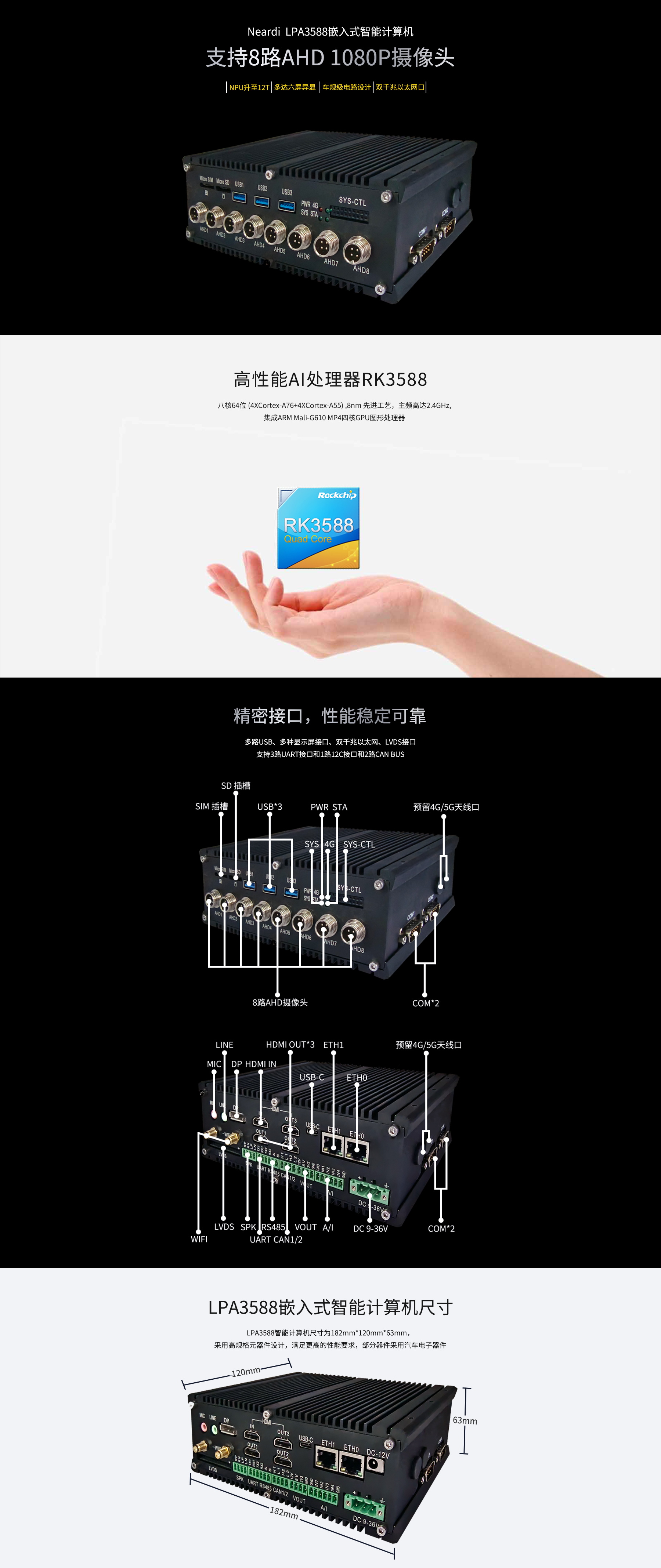 產(chǎn)品介紹 :LPA3588智能計算機提供3路USB 3.0 HOST和1路全功能Type-C接口,支持連接多個USB攝像頭,以及2個mini-PCIe接口用于擴展4G/5G模塊或NPU計算卡。通訊方面,支持雙頻WIFI 6、藍牙5.0、2路1000M以太網(wǎng)、CANBUS、RS485等。顯示接口包括3路HDMI輸出、1路HDMI輸入、1路DP輸出、1路雙通道LVDS接口,支持音頻輸入輸出和多屏異顯,內置M.2 NVMe固態(tài)硬盤接口。